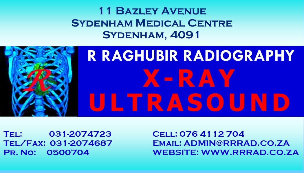 TELEPHONE TEL/FAX AFTERHOURS/EMERGENCY CELL WEBSITE PHYSICAL ADDRESS | 031 207 4723 031 207 4687 076 411 2704 admin@rrrad.co.za WWW.RRRAD.CO.ZA 11 BAZLEY AVENUE SYDENHAM MEDICAL CENTRE SYDENHAM 4091 |